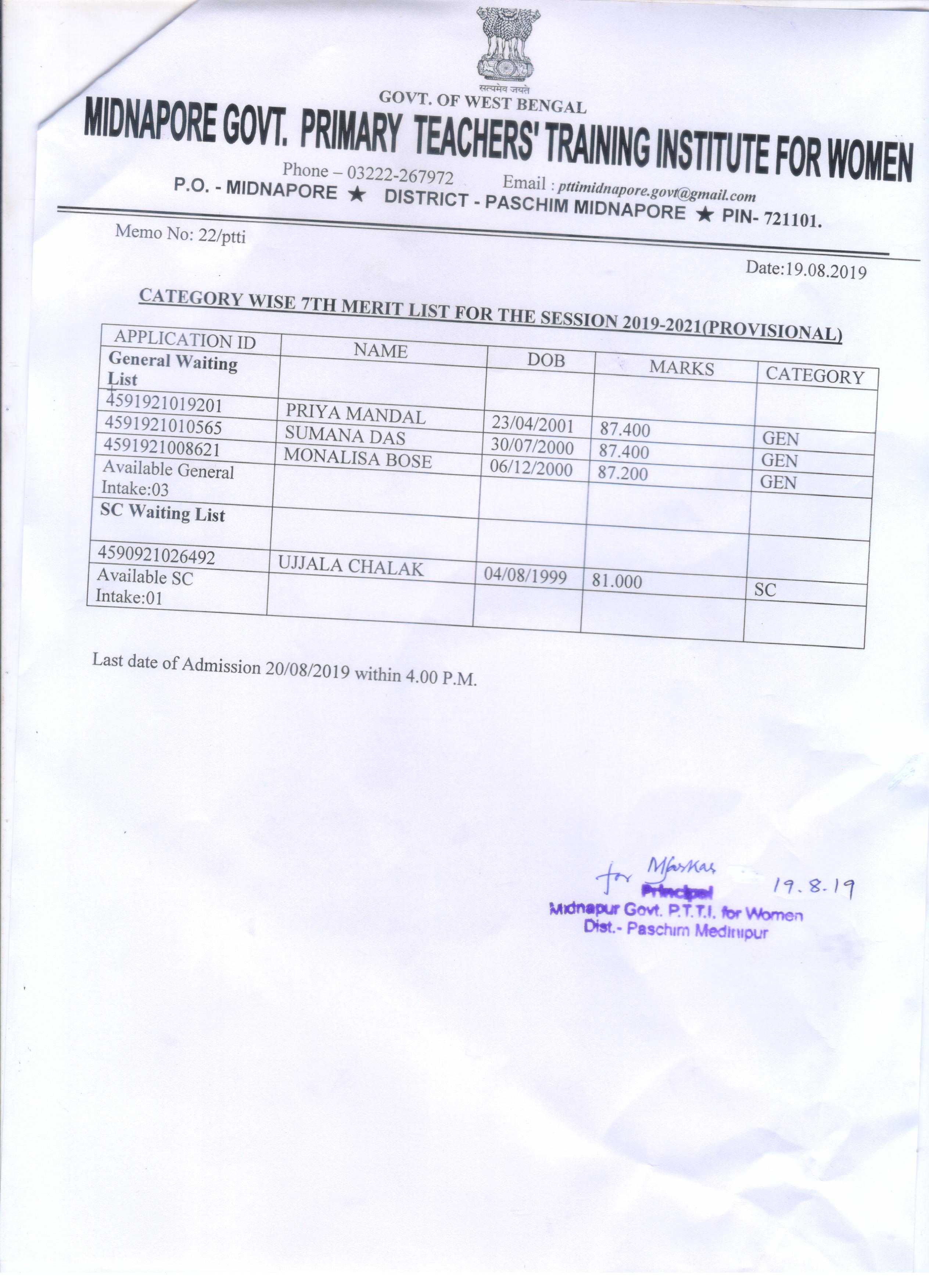 7th merit list for admission of 2 years d.el.ed course for the session 2019-2021.
